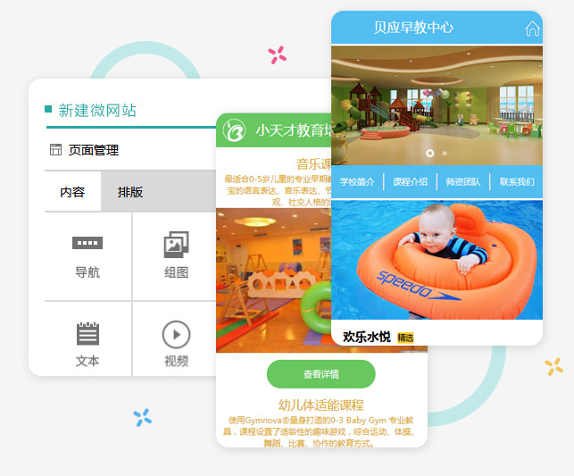 提供适合各类培训学校,丰富多样的网站模板及组件,支持可视化拖拽式编辑,简单填写内容即可一键生成学校专属微网站