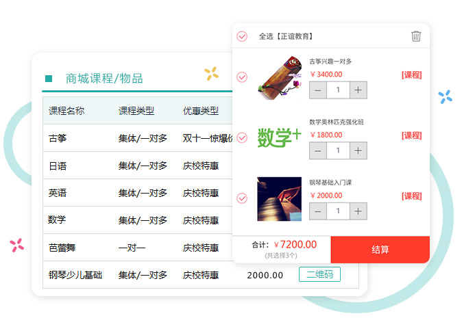 支持课程、物品一键发布直接同步微商城,让家长足不出户动动手指,即可轻松实现在线选课报各、选购教材或其他学习用品